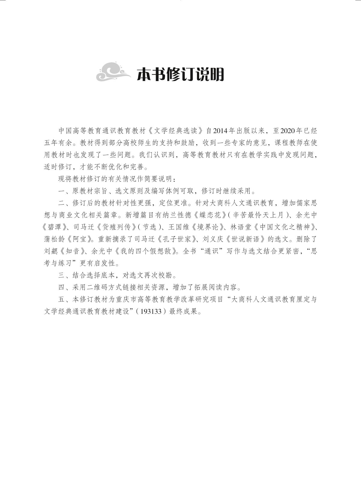 前辅文 诗词曲 木瓜 咏史(左思) 春江花月夜(张若虚) 月下独酌(其一)(李白) 蝶恋花·春景(苏轼) 天净沙·秋思(马致远) 蝶恋花(纳兰性德) 过旧居(戴望舒) 断章(卞之琳) 碧潭(余光中) 神女峰(舒婷) 伊利亚特(节选) 纸船(泰戈尔) 蜜腊波桥(阿波利奈尔) 散文 大学之道 孔子世家(节选)(司马迁) 货殖列传(节选)(司马迁) 陋室铭(刘禹锡) 前赤壁赋(苏轼) 百丈山记(朱熹) 徐文长传(节选)(袁宏道) 西湖七月半(张岱) 弈喻(钱大昕) 境界论(王国维) 中国文化之精神(林语堂) 给亡妇(朱自清) 说园(陈从周) 我与地坛(节选)(史铁生) 瓦尔登湖(节选)(梭罗) 社会与个人(爱因斯坦) 戏剧 长亭送别(王实甫) 惊梦(节选)(汤显祖) 雷雨(节选)(曹禺) 伪君子(节选)(莫里哀) 玩偶之家(节选)(易卜生) 小说 世说新语(三则)(刘义庆) 阿宝(蒲松龄) 转运汉巧遇洞庭红(节选)(凌濛初) 指迷十二钗(曹雪芹) 边城(节选)(沈从文) 小二黑结婚(赵树理) 围城(节选)(钱锺书) 红高粱(节选)(莫言) 青龙偃月刀(韩少功) 活着(节选)(余华) 百年孤独(节选)(加西亚·马尔克斯) 傲慢与偏见(节选)(简·奥斯汀) 安娜·卡列尼娜(节选)(列夫·托尔斯泰) 后记 第二版后记