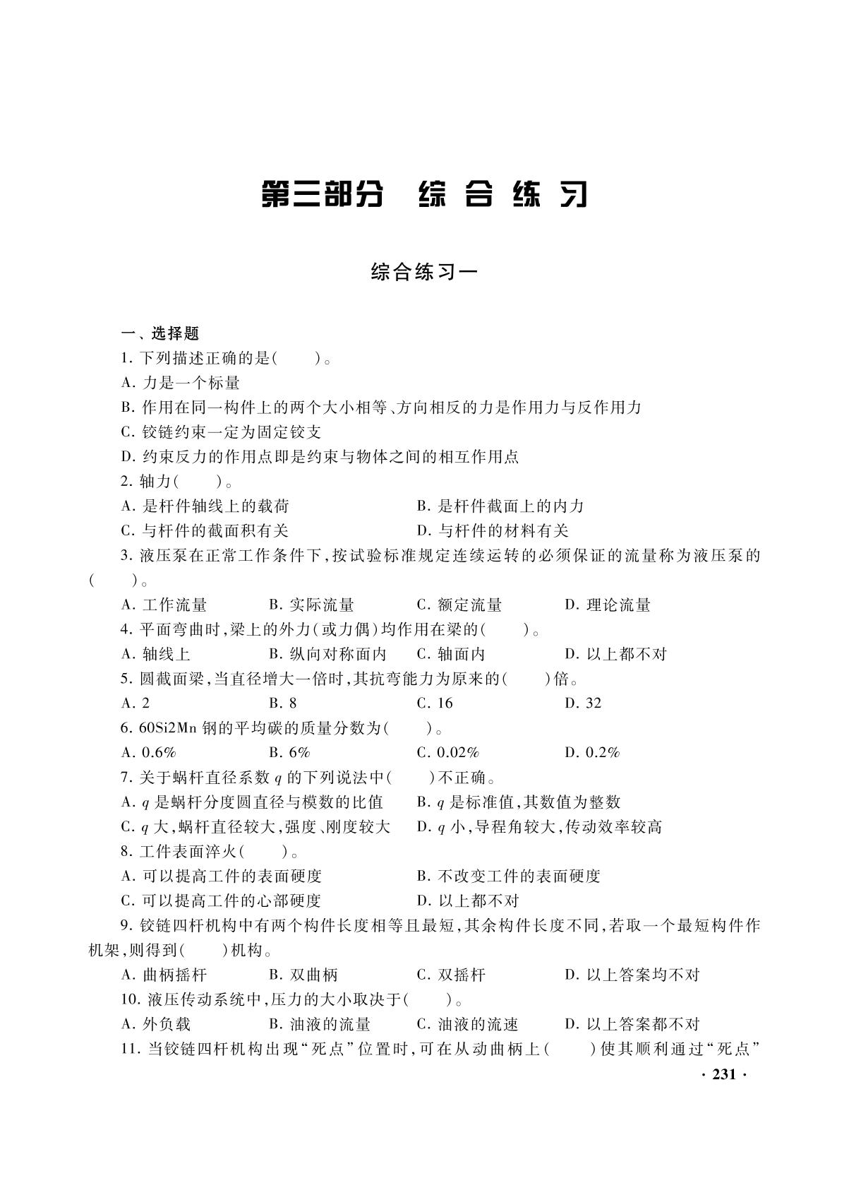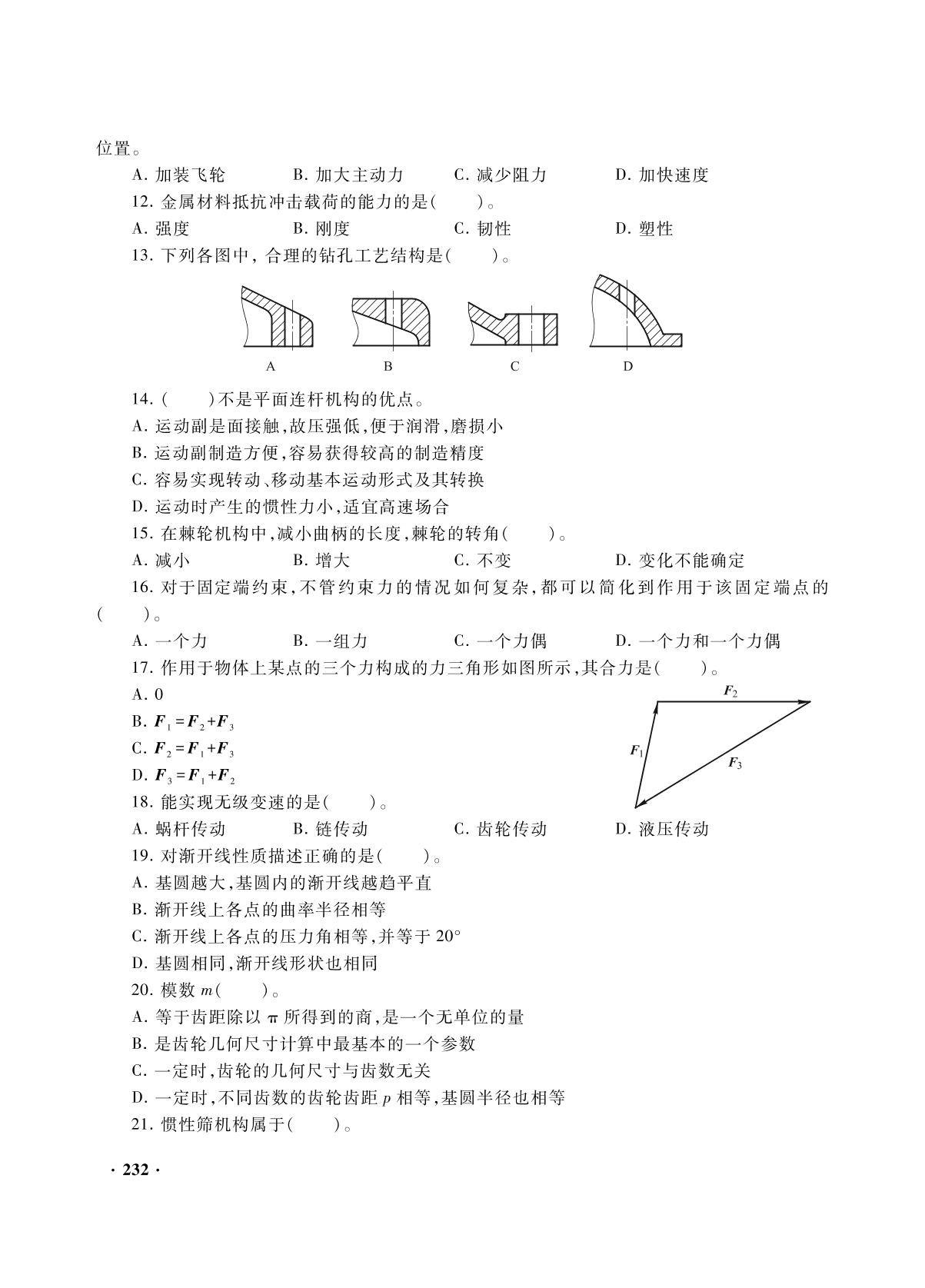 前辅文 第一部分 考试大纲 一、考试范围和考试形式 二、专业理论考试试卷结构 三、专业理论考试内容和要求 四、专业技能测试内容和要求(机械) 五、专业技能测试内容和要求(汽修) 第二部分 复习指南 机械基础 Ⅰ 机械概述 Ⅱ 理论力学 Ⅲ 材料力学 Ⅳ 金属材料及热处理 Ⅴ 机械零件 Ⅵ 常用机构 Ⅶ 带传动和链传动 Ⅷ 齿轮传动 Ⅸ 蜗杆蜗轮传动 Ⅹ 齿轮系 Ⅺ 液压传动 机械制图 Ⅰ 制图基本知识 Ⅱ 几何作图 Ⅲ 正投影与三视图 Ⅳ 轴测图 Ⅴ 组合体视图 Ⅵ 机件的表达方法 Ⅶ 标准件和常用件 Ⅷ 零件图 极限配合与技术测量 技能测试要求 Ⅰ 钳工工种 Ⅱ 车工工种 Ⅲ 汽车修理工种 第三部分 综合练习 综合练习一 综合练习二 综合练习三 综合练习四 综合练习五 综合练习参考答案