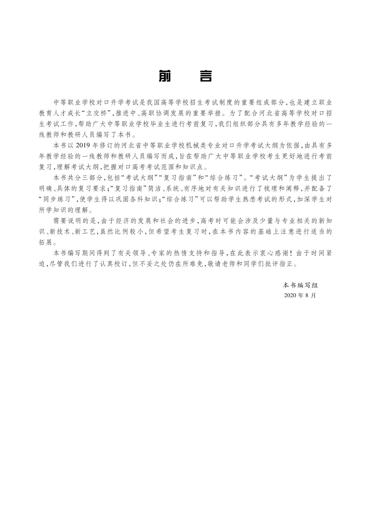 本书以2019年修订的河北省中等职业学校机械类专业对口升学考试大纲为依据,由具有多年教学经验的一线教师和教研人员编写而成,旨在帮助广大中等职业学校考生更好地进行考前复习,理解考试大纲,把握对口高考考试范围和知识点。
