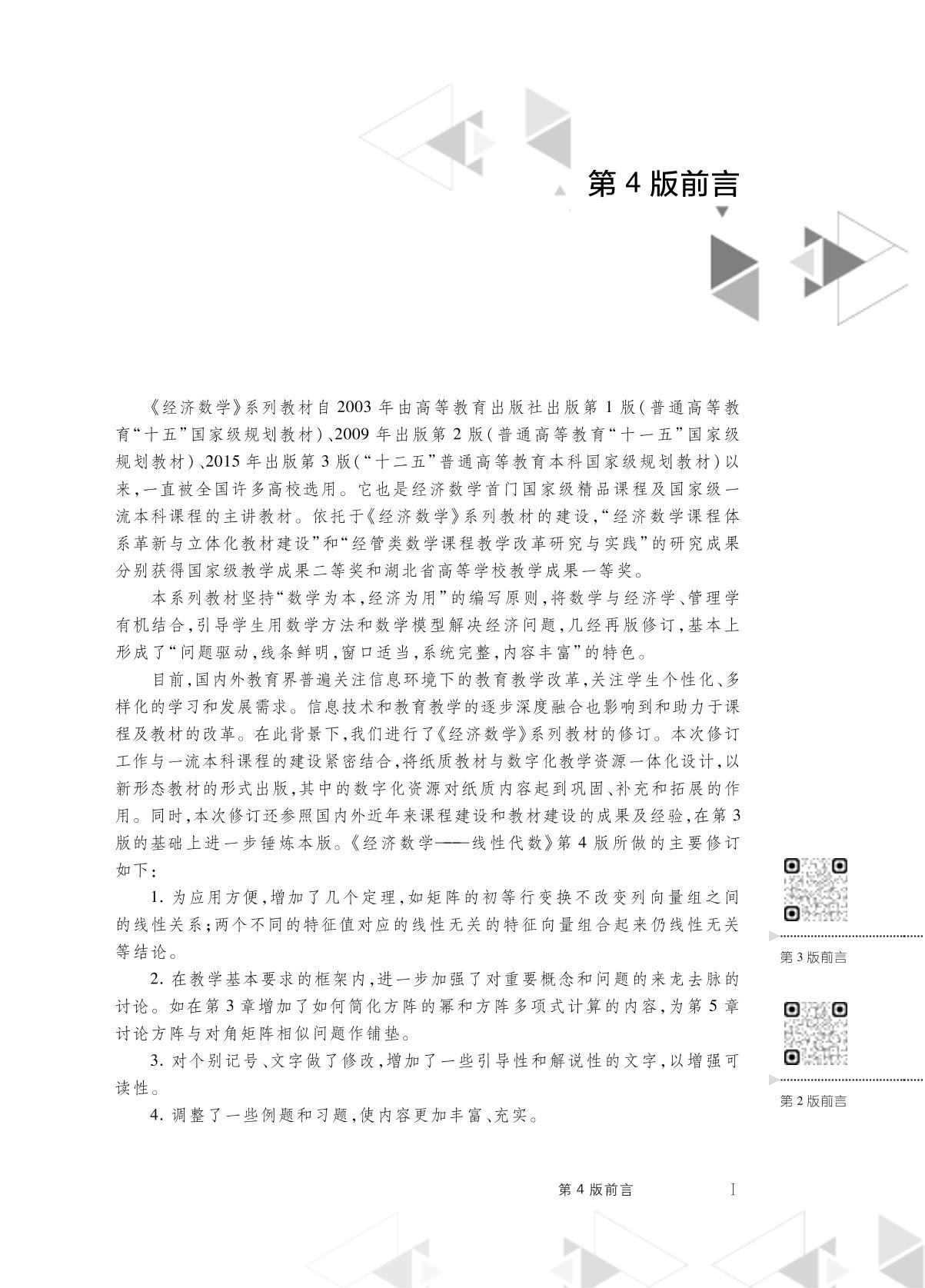 本书是“十二五”普通高等教育本科国家级规划教材,也是经济数学首门国家级精品课程以及国家级一流本科课程的主讲教材,是在第三版的基础上修订而成的。 本书以线性方程组和实二次型化成标准形为两条主线展开讨论,主要内容包括:线性方程组的消元法和矩阵的初等变换,行列式、克拉默法则,矩阵的运算,线性方程组的理论,特征值和特征向量、矩阵的对角化,二次型,应用问题等。全书内容的深度和广度符合“经济和管理类本科数学基础课程教学基本要求”。此外,在书中的不同章节以二维码形式链接了若干微视频,包括内容讲解、典型例题、内容拓展等,为学生提供了一种个性化、多样化的学习途径;在每章后附有在线测试题,供学生自主练习。 本书几经改版修订,集科学性、先进性、适用性于一体,较好地处理了数学与经济、经典与现代、理论与应用、知识与素质、教与学诸多复杂关系,具有“问题驱动,线条鲜明,窗口适当,系统完整,内容丰富”的鲜明特色。 本书结构严谨,逻辑清晰,叙述清楚,说明到位,行文流畅,例题典型,习题配备合理,可读性强,可作为高等学校经济管理类专业的教材或全国硕士研究生招生考试的参考书,也可供理工科专业学生参考。 |