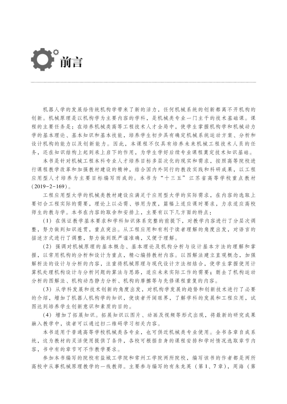 本书详细阐述了机构学中常用机构的工作原理、分析和设计方法。本书以培养学生创新意识和机械系统方案设计能力为目标,以设计为主线,以适应本科教育大众化的时代特点和培养高级应用型人才的需要。 本书共分12章,主要内容有绪论、平面机构的组成分析、平面连杆机构、凸轮机构、齿轮机构、轮系、其他常用机构、机器人机构学、机械系统动力学、机械的平衡、机械执行系统方案设计和机械传动系统方案设计。 作为对教材内容的补充和深化,本书还配有网络电子资源,即在本书内容的基础上增加了图形、动画及视频文件,可扫各章节中二维码查看。 本书主要作为普通高等院校机械工程类专业的教学用书,也可作为近机械类和非机械类专业学生、科研人员及有关工程技术人员的参考书。 |