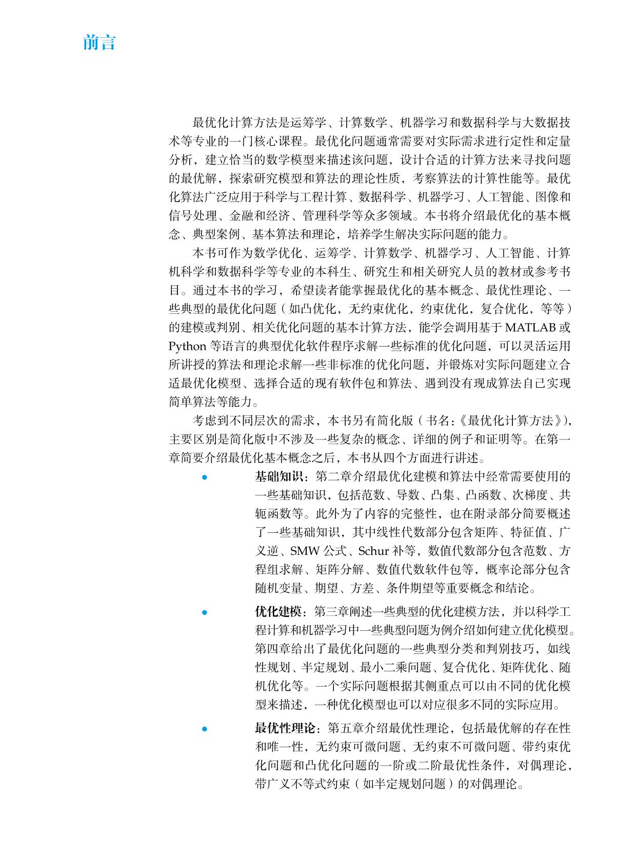 本书介绍了最优化的基本概念、典型案例、基本理论和优化算法。典型案例来自数据科学、机器学习、人工智能、图像和信号处理等领域,基本理论涵盖最优解的存在性和唯一性、各类优化问题的一阶或二阶最优性条件、对偶理论等,优化算法包括无约束优化算法、约束优化算法、复合优化算法。全书案例丰富,理论翔实,展现了最优化的“实践—算法—理论—实践”这一特点。书中配备了适量的习题,这些习题难易兼顾、层次分明,为正文的内容提供补充,并可检验读者的学习效果。 本书可作为高等学校数据科学专业的教材或参考书,供研究生和本科高年级学生使用,也可供从事运筹学、计算数学、图像和信号处理、机器学习、人工智能等领域的科技工作者参考。 |