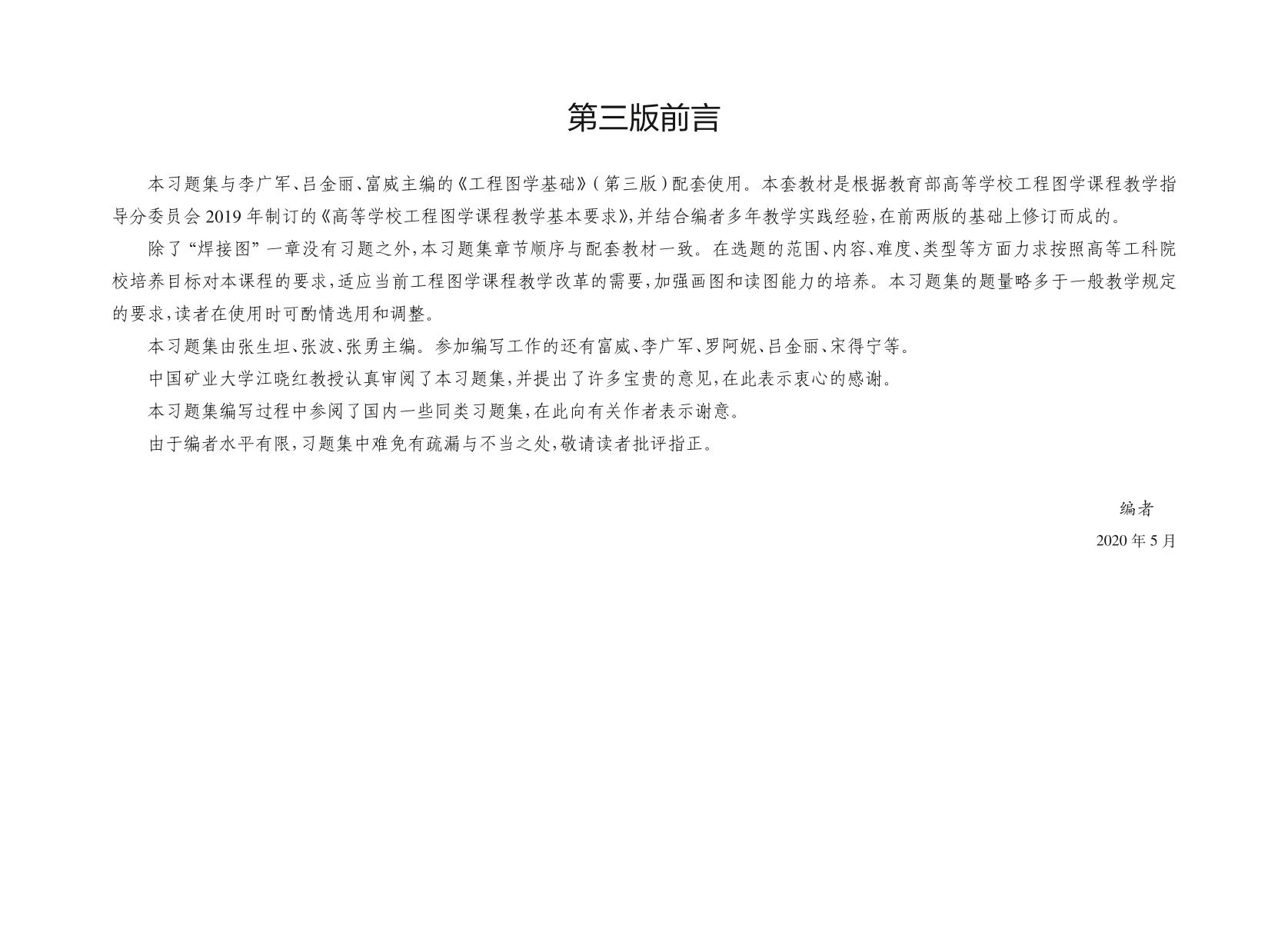 本习题集与李广军、吕金丽、富威主编《工程图学基础》(第三版)配套使用。本套教材是根据教育部高等学校工程图学课程教学指导分委员会2019年制订的《高等学校工程图学课程教学基本要求》,并结合编者多年教学实践经验,在前两版的基础上修订而成的,为哈尔滨工程大学依托中国大学MOOC平台建设的“机械制图”在线开放课程(首批国家级一流本科课程)的主讲教材。 本习题集的主要内容包括制图的基本知识,点、直线和平面的投影,立体及其表面的交线,组合体,计算机绘图基础,轴测图,图样的基本表示法,标准件和常用件,零件图,装配图等。 本习题集可作为高等学校本科非机类、近机类各专业工程图学课程的教材,也可供有关工程技术人员参考。 |