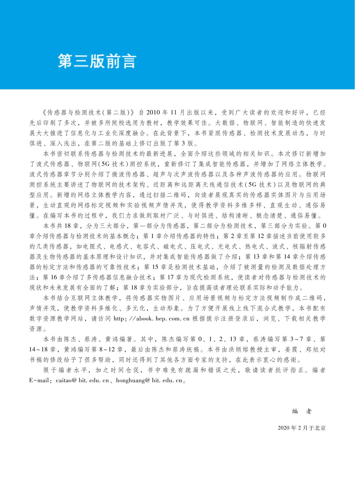 本书为“十二五”普通高等教育本科国家级规划教材,是北京高等教育精品教材。 本书系统地论述了各种传感器的基本原理、基本特性、信号调节电路、设计原理以及它们在电量和非电量检测系统中的应用。 全书共18章,分为三大部分,第一部分为传感器,第二部分为检测技术,第三部分为实验。第0章介绍传感器与检测技术概念;第1章介绍传感器的特性;第2章至第12章描述当前使用较多的几类传感器,如电阻式、电感式、电容式、磁电式、压电式、光电式、热电式、波式、核辐射传感器及生物传感器的基本原理和设计知识,并对集成智能传感器做了介绍;第13章和第14章介绍传感器的标定和传感器的可靠性技术;第15章是检测技术基础,介绍了被测量的检测及数据处理方法;第16章介绍了多传感器信息融合技术;第17章为现代检测系统,介绍了传感器与检测技术的现状和未来发展;第18章为传感器与检测技术实验,旨在提高读者理论联系实际的动手能力。 本书结合互联网立体教学,将传感器实物图片、应用场景视频与标定方法视频制作成二维码,声情并茂,使教学资料多维化、多元化,生动形象。同时本书配有Abook数字资源网站,主要内容有讲义PPT、讲课视频、传感器实物图片,以方便教师授课、学生线下学习。 本书结合近些年大数据、物联网、智能制造等新兴技术的发展,增加了传感器与检测技术研究的新成果,取材新颖,内容丰富,广深兼顾,与时俱进,以适应不同层次的对象使用,可作为自动化类、仪器类及相关专业的本科生、高职高专及研究生教材,也可供有关工程技术人员使用参考。 |