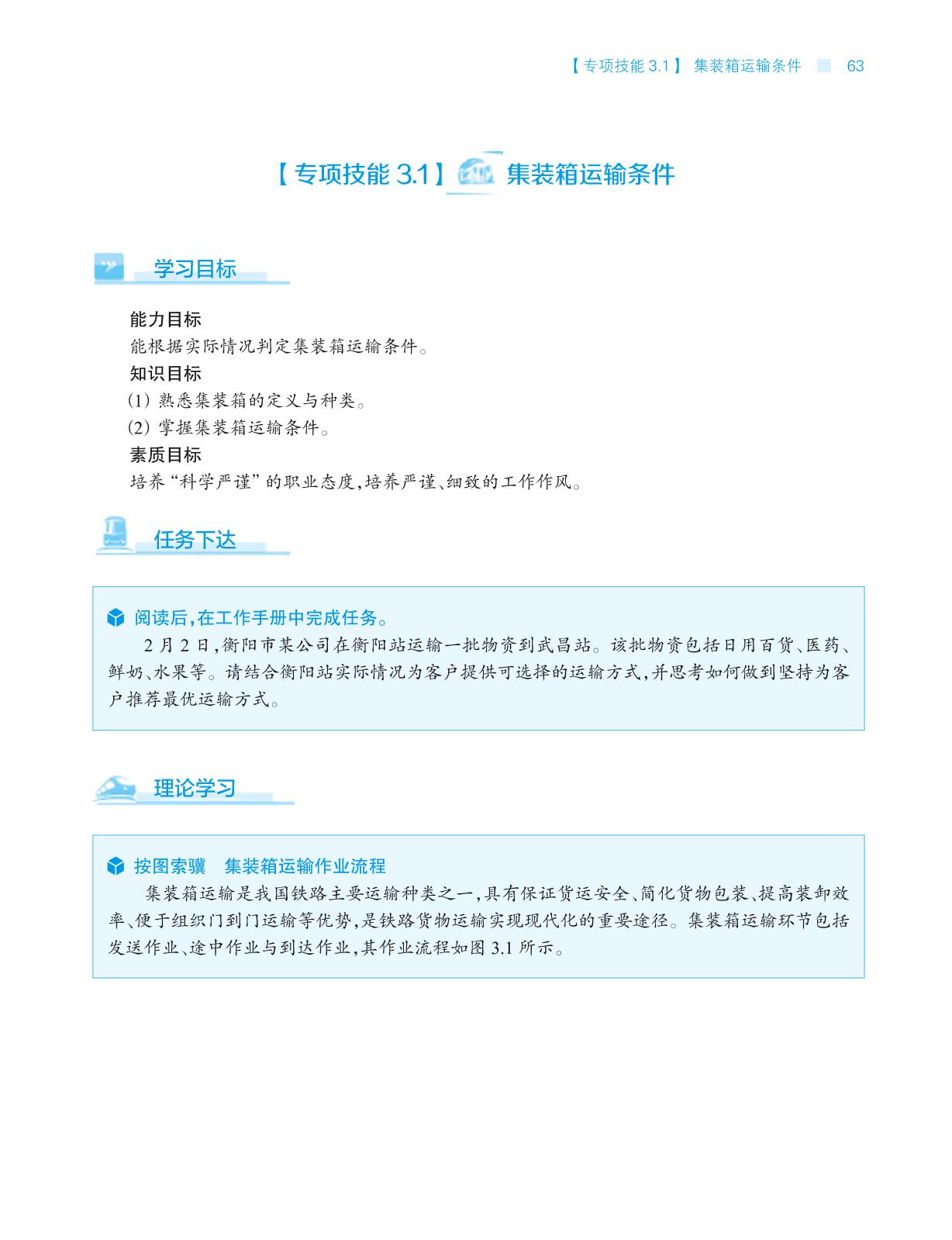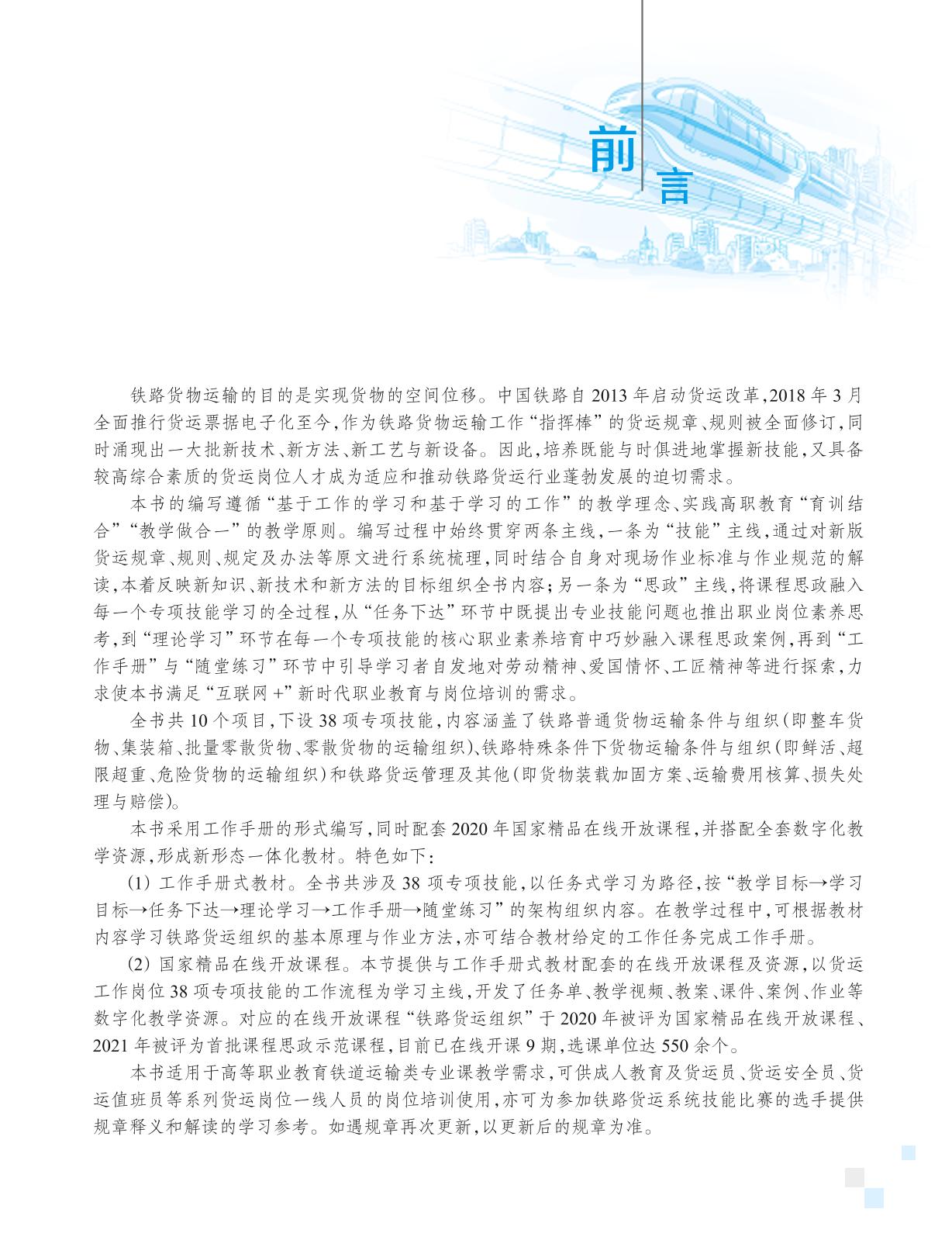 本书是工作手册式新形态一体化教材,也是2020 年国家精品在线开放课程、首批课程思政示范课程配套教材。内容包括:铁路货物运输的种类和办理条件、整车货物(含批量零散货物快运)运输、集装箱运输、零散货物运输、铁路货物装载加固、铁路货物运输费用核算、铁路货物损失处理与理赔、鲜活货物运输、超限超重货物运输、危险货物运输。 本书适用于高等职业教育铁道运输类专业教学需求,可供成人教育及货运员、货装值班员、货运调度员等系列货运岗位一线人员的岗位培训使用,亦可为参加铁路货运系统技能比赛的选手提供规章释义和学习参考。 本书重点/ 难点的知识点/ 技能点配有动画、微课等丰富的数字化资源,视频类资源可通过扫描书中二维码在线观看,学习者也可登录“智慧职教”(www.icve.com.cn)搜索课程“铁路货运组织”进行在线学习。授课教师如需要本书配套的教学课件等资源或有其他需求,可发送邮件至邮箱gzjx@pub.hep.cn 联系索取。 |