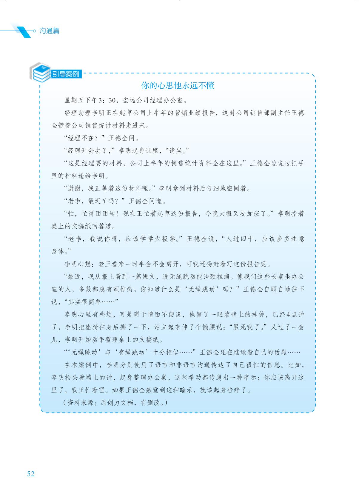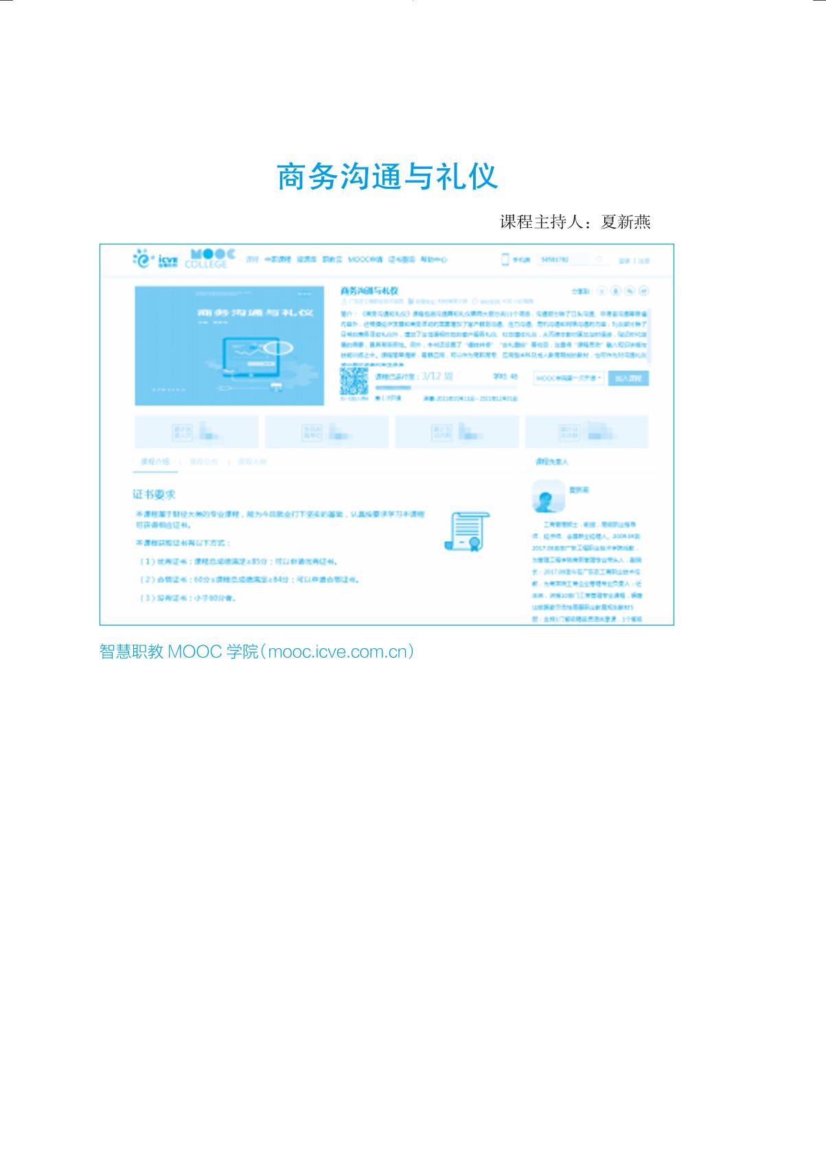 本书是高等职业教育财经商贸类专业通识课程职业能力与素质养成教材,也是高等职业教育在线开放课程新形态一体化教材。 本书包括沟通篇和礼仪篇两大部分,共11个项目40个任务。沟通部分除了口头沟通与倾听、非语言沟通等普适性内容外,还根据经济社会发展和商务活动的需要增加了客户服务沟通、压力沟通、网络沟通和危机沟通的内容;礼仪部分除了日常的商务形象礼仪、商务交往礼仪外,还增加了与沟通相对应的客户服务礼仪和商务专题活动礼仪,从而使本书更加与时俱进,贴近时代发展和职业实践,更具有实用性。另外,本书还设置了“德技并修”“古礼重拾”等栏目,注重将“课程思政”融入知识讲授与技能训练之中。 本书可以作为高等职业院校、职业本科教育及成人教育院校的教材,也可作为对商务沟通与礼仪感兴趣的人士的自学参考书。 本书配套建设有视频、微课、案例等教学资源,读者可以扫描书中二维码浏览相关资源,也可以登录智慧职教MOOC学院(mooc.icve.com.cn)搜索“商务沟通与礼仪”在线开放课程进行学习,并可根据书后“郑重声明”页的资源服务提示获取教学PPT等资源。 |