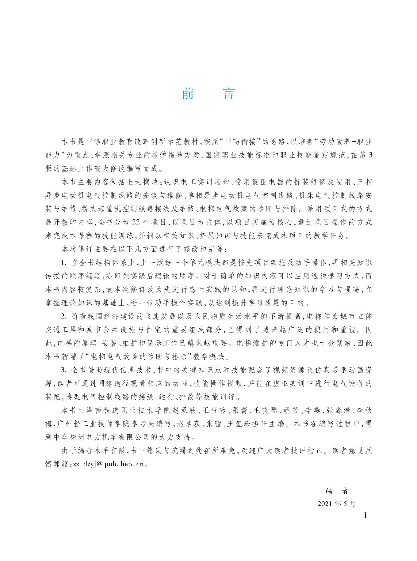 本书是中等职业教育改革创新示范教材,按照“中高接续”的思路,以培养“劳动素养+职业能力”为重点,参照相关专业的教学指导方案、国家职业技能标准和职业技能鉴定规范编写而成。 本书主要内容包括认识电工实训场地、常用低压电器拆装维修与使用、三相异步电动机电气控制线路安装与维修、单相异步电动机电气控制线路、机床电气控制线路安装与维修、桥式起重机控制线路接线及维修以及电梯电气故障诊断与排除。每个内容原则上都包含相关知识、相关技能及考核鉴定,充分体现了理实一体化的教学理念,结合生产实践,突出操作技能,注重能力培养。 本书配有视频动画及仿真教学动画等数字化教学资源,请登录Abook网站http://abook.hep.com.cn/sve获取相关资源。详细说明见本书“郑重声明”页。 本书除作为中等职业学校电气设备运行与控制相关专业教学用书外,也可作为相关行业技术工人岗位培训用书或作为相关教师、机电专业人员的参考用书。 |