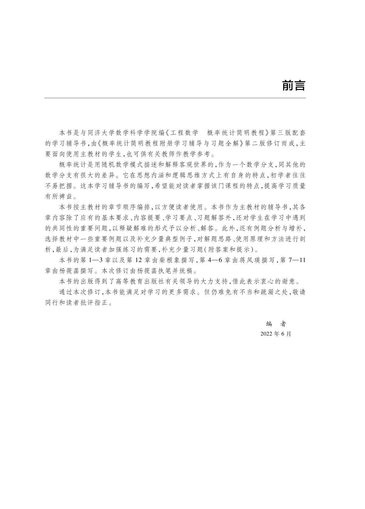 本书是与同济大学数学科学学院编《工程数学 概率统计简明教程》第三版配套的学习辅导书,主要面向使用该教材的学生,也可供有关教师作教学参考。与主教材一致,本书共有12章。除第十二章外,各章内容包括基本要求、内容提要、学习要点、释疑解难、例题分析及增补、习题解答和练习等栏目,其中释疑解难和例题分析有助于加深对教材内容的理解以及对教学难点的把握。本书编者均为《工程数学 概率统计简明教程》第三版的作者,具有丰富的教学经验和编写经验。 本书相对于主教材有一定的独立性,也可作为工科和其他非数学类专业概率统计课程的学习参考书。 |