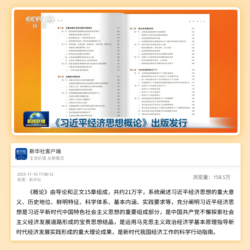 《习近平经济思想概论》由导论和正文15章组成。正文由五部分构成,第一部分包括第一章,阐述了推进中国式现代化是我国经济发展的目标指向。第二部分包括第二章,阐述了加强党对经济工作的全面领导,是我国经济发展的根本保证。第三部分包括第三章至第八章,阐述了坚持以人民为中心的发展思想、坚持和完善社会主义基本经济制度、全面深化改革开放、完整准确全面贯彻新发展理念、构建新发展格局、推动高质量发展,是我国经济发展的原则理念。第四部分包括第九章至第十四章,阐述了加快发展新质生产力、建设现代化产业体系、推动城乡融合发展、促进区域协调发展、倡导普惠包容的经济全球化、统筹发展和安全,是我国经济发展的重大部署。第五部分包括第十五章,阐述了坚持正确工作策略和方法,是做好经济工作的方法论。这五个部分构成了习近平经济思想逻辑严谨和内涵丰富的科学体系。 |