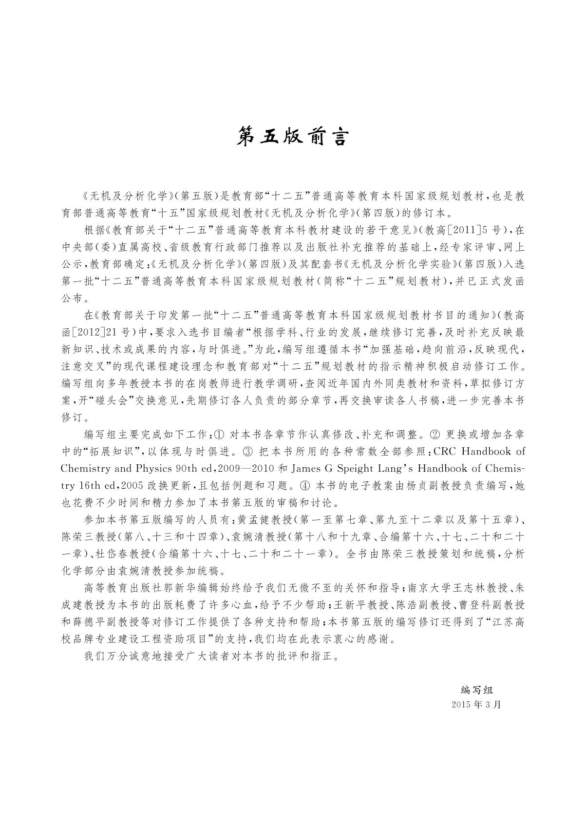 本书为“十二五”普通高等教育本科国家级规划教材,是在第四版的基础上修订而成的。此次修订努力遵循“加强基础,趋向前沿,反映现代,注意交叉”的现代课程建设理念,将第四版做了认真的补充与完善。全书分为两部分,第一章到第十五章为无机化学部分,第十六章到第二十一章为分析化学部分。各章前有学习要求,正文中还提供了可以自学的“拓展知识”,书后附习题答案与索引。 本书可作为综合性大学和师范院校生物学等近化学化工类专业的教材,也可作为农、林、医药院校有关专业的教材或参考书。 |