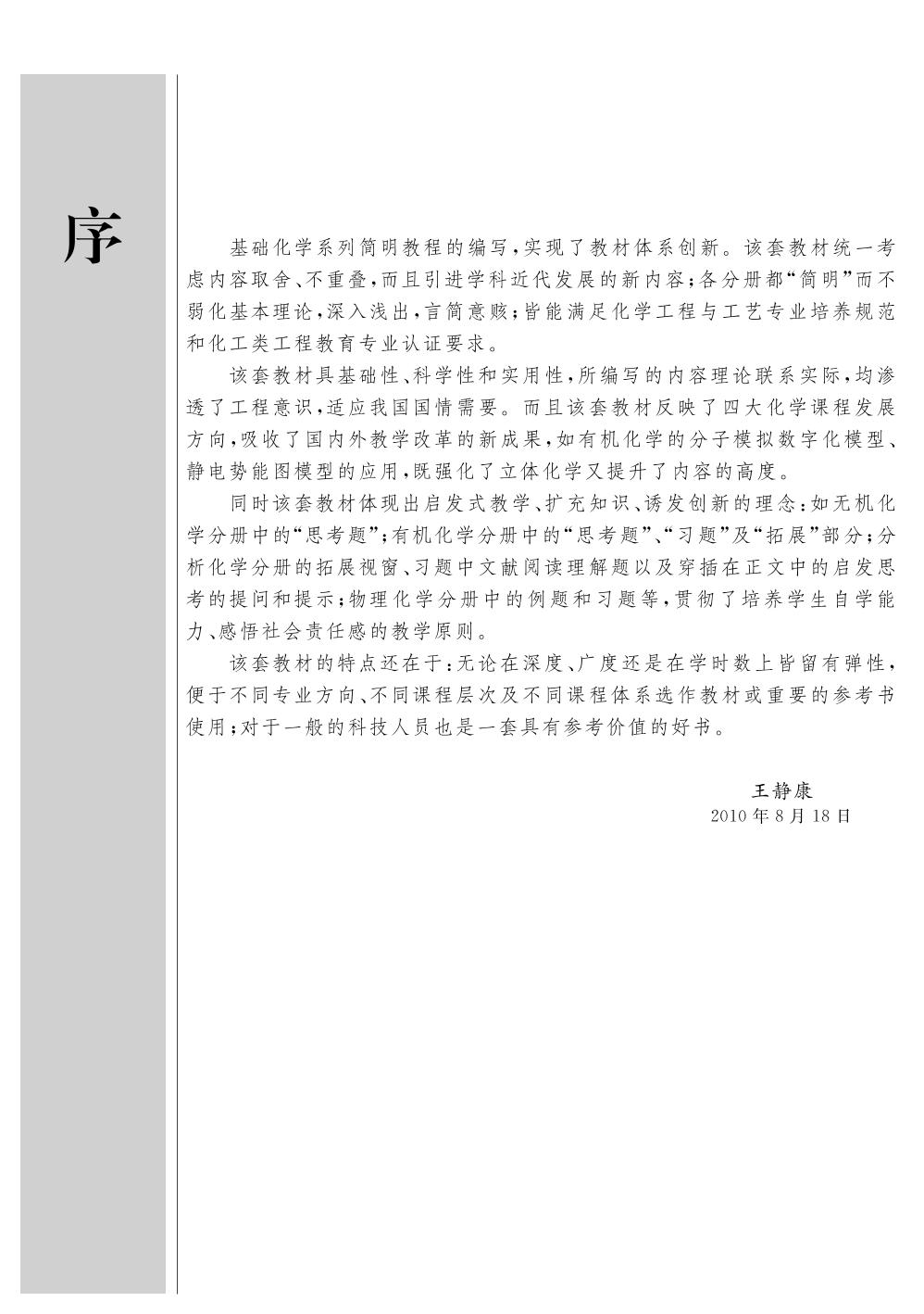 根据化工类工程教育专业认证的要求,结合教育部高等学校化学与化工学科教学指导委员会新近制定的“化学工程与工艺专业培养方案与规范(草案)”和“近化学类专业化学基础课程教学基本要求(草案)”,兼顾相关专业的需求,天津大连、大连理工大学、浙江大学、北京化工大学四校联合编写了基础化学系列简明教程,这套系列简明教程既保证了必要的基础理论,又突出了工科专业的应用性;既着眼于化学工程与工艺专业,又适合于制药、材料、纺织、食品、环境、能源、生物学、医学、药学、农学等专业。 本书是其中的无机化学分册,包括化学反应基本原理、物质结构基础知识和元素化学的核心内容,编写中注意突出应用和渗透工程意识,力求简明实用,符合少学时无机化学课程教学的需要,可作为化工、制药、环境、轻工、纺织、材料、冶金、地质等各专业无机化学课程教材,也可供其他院校相关专业少学时无机化学课程选用。 |