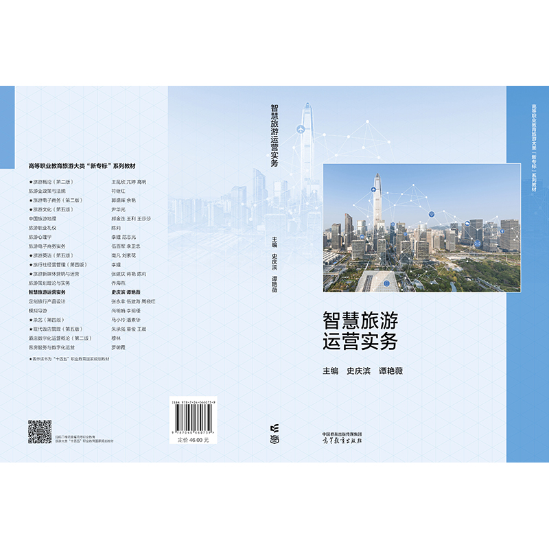 本教材为高等职业教育旅游大类“新专标”系列教材之一。教材立足智慧旅游业态发展前沿实际,针对高等职业教育旅游类专业数字化转型升级和专业教学标准的要求,聚焦学习者职业能力和综合素质的培养,围绕智慧旅游业务生态、应用场景、工作过程和典型任务,结合具体岗位工作实际,设计了应用于旅游目的地、景区、酒店、旅行社和在线旅行等业务环境下的智慧旅游发展认知、技术概析、运行管理、服务解析、营销探索和规划指引6个模块,共19个单元,每个模块设有学习目标、重难点,每个单元设有引导案例、知识准备、知识拓展、实践演练、思考题等栏目,全面引导学习者熟悉智慧旅游业务全貌。 本教材配套建设有数字化教学资源,包括微课、案例、动画、习题、实训等资源,可通过扫描书中的二维码进行在线学习,有助于提升学习者的学习兴趣,助力学生在学习的同时提升多种能力。教师如需本书授课用PPT等配套资源,请登录“高等教育出版社产品信息检索系统”(http://xuanshu.hep.com.cn)免费下载。 本教材可以作为高等职业教育专科及本科旅游大类相关专业的教学用书,也可作为旅游管理部门、景区、酒店、旅行社及在线旅游企业相关工作人员的参考用书。 |
