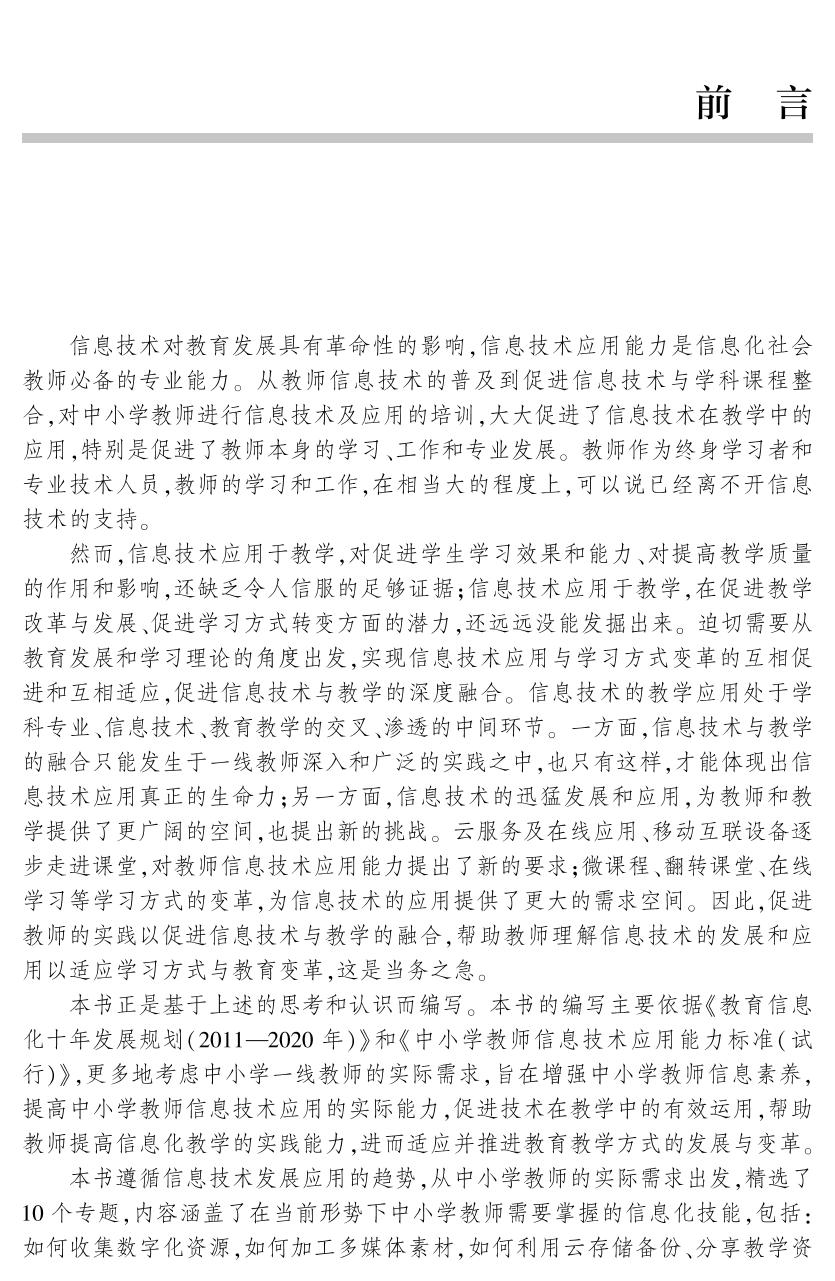 本书依据《中小学教师信息技术应用能力标准(试行)》,结合信息技术发展应用的趋势和中小学教师信息化教学的实际需求,精选了具有较高实用价值的10项信息化教学技能,编写了10个专题,主要包括:数字化教学资源的收集,音频和视频文件的编辑,利用网盘管理数字化教学资源,演示文稿的设计与应用,图像的编辑,思维导图的制作与应用,即时通信工具的使用,利用维基创建在线协作学习平台,利用电子表格统计数据,在线问卷调查。 书中配有13个核心学习内容的教学视频,在网络环境下,使用手机扫二维码即可观看。 本书以教师的实际工作流程为主线设计专题,每个专题通过情境导入、学习活动、应用拓展三个环节,力图有效提升教师信息技术应用能力,促进在线学习、混合学习、翻转课堂等方式方法的实践探索,促进信息技术与教学的深度融合。 本书可作为中小学教师教育技术能力提升的培训教材,也可供中小学教师自学使用。 |