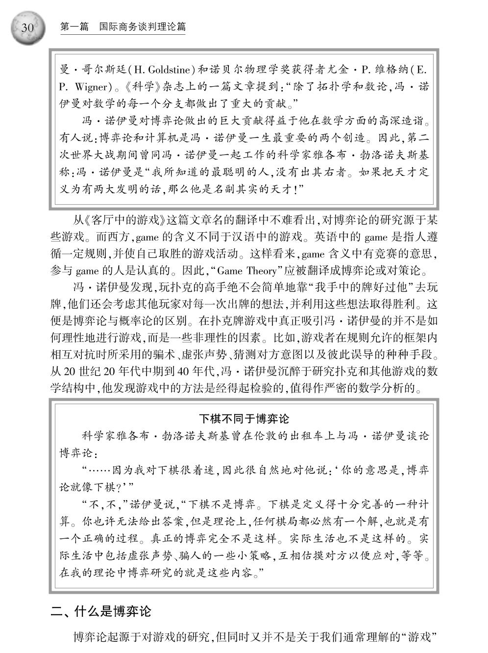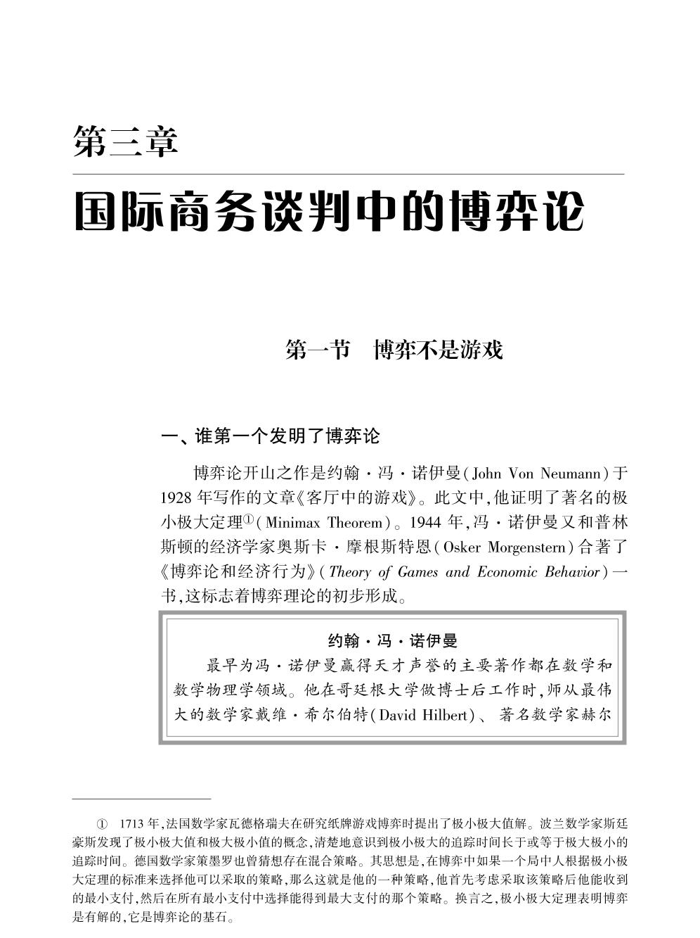 序 前言 第一篇 国际商务谈判理论篇 第一章 国际商务谈判的概念、类型和作用 第一节 国际商务谈判的概念与特征 第二节 国际商务谈判的类型 第三节 国际商务谈判的作用 第二章 国际商务谈判的“需要理论” 第一节 需要的概念 第二节 国际商务谈判的“需要理论”概述 第三节 发现谈判对方的需要 第三章 国际商务谈判中的博弈论 第一节 博弈不是游戏 第二节 几个基本术语 第三节 几种典型的博弈 第四节 谈判者的困境 第五节 博弈论在谈判中的应用举例 第二篇 国际商务谈判实务篇 第四章 国际商务谈判前的准备工作 第一节 谈判前的探询工作 第二节 谈判准备工作的基本内容 第三节 谈判计划的拟订 第四节 谈判的组织管理 第五节 模拟谈判 第五章 国际商务谈判的结构和过程 第一节 国际商务谈判的结构 第二节 国际商务谈判的开始阶段 第三节 国际商务谈判的实质性阶段 第四节 国际商务谈判的交易明确阶段 第五节 国际商务谈判的结束阶段 第六章 国际商务谈判的法律规范 第一节 国际商务谈判的合同签订 第二节 国际商务谈判的合同格式 第三节 国际商务谈判的合同履行 第四节 国际商务谈判的合同违约处理 第七章 国际商务谈判的技巧 第一节 谈判技巧的概念 第二节 谈判技巧的类型 第三节 国际商务谈判技巧的运用 第八章 国际商务谈判中的时间战术和信息战术 第一节 国际商务谈判中的时间战术 第二节 国际商务谈判中的信息战术 第九章 国际商务谈判的语言与非语言沟通 第一节 国际商务谈判语言沟通的类型与艺术 第二节 国际商务谈判语言沟通的策略 第三节 国际商务谈判中的辩论 第四节 国际商务谈判非语言沟通的特点、作用及表现形式 第五节 国际商务谈判非语言沟通需要注意的问题 第十章 在线电子商务谈判 第一节 在线电子商务谈判概述 第二节 在线电子商务谈判支持系统 第三篇 国际商务谈判文化礼仪篇 第十一章 国际商务谈判的礼仪与禁忌 第一节 服饰的礼仪与禁忌 第二节 不同活动中的礼仪与禁忌 第三节 不同国家的风俗习惯与礼仪禁忌 第十二章 文化因素对国际商务谈判的影响 第一节 跨文化差异的特征及其影响 第二节 影响西欧谈判的文化因素 第三节 影响北美谈判的文化因素 第四节 影响中东谈判的文化因素 第五节 影响拉美谈判的文化因素 第十三章 哈佛谈判法则 第一节 哈佛谈判法则与传统谈判方式的比较 第二节 哈佛谈判法则的内容 附录 谈判模拟训练 参考文献 版权