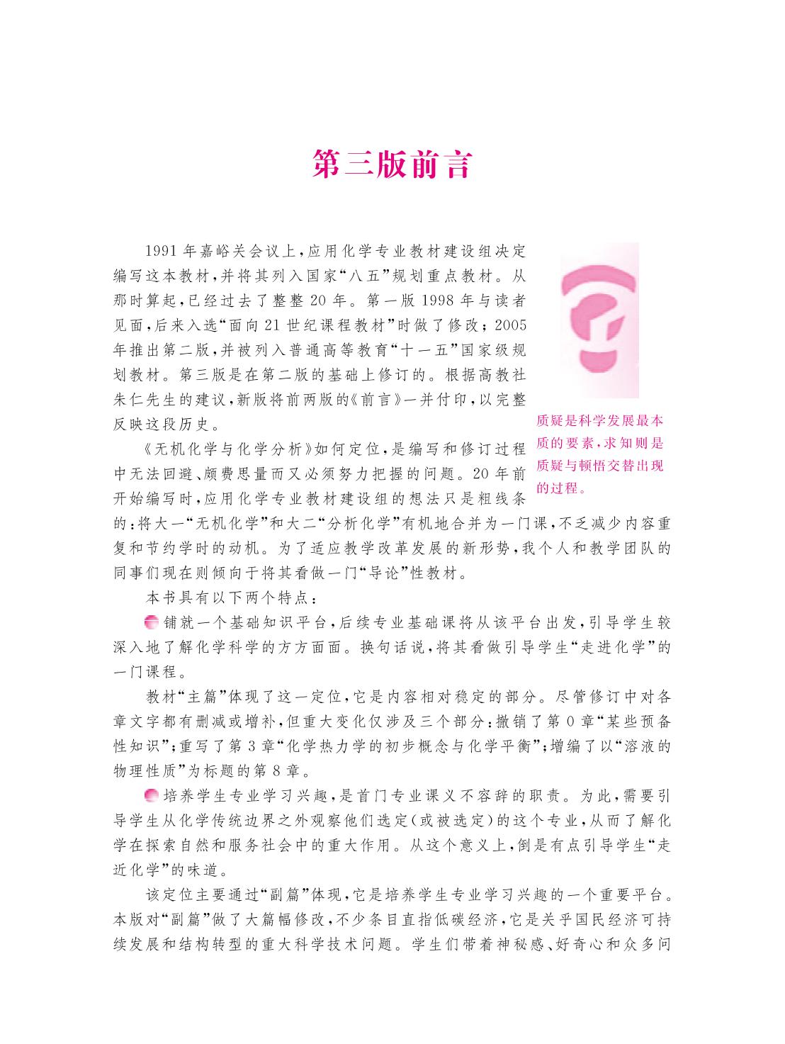 本书是面向21世纪课程教材和“十二五”普通高等教育本科国家级规划教材。本书是为应用化学专业编写的一本基础课教材,是在普通高等教育“十一五”国家级规划教材《无机化学与化学分析》(2005年第二版)的基础上修订而成的。 本书分为主篇和副篇。主篇内容包括原子结构和元素周期表、化学键与分子结构、化学热力学的初步概念与化学平衡、化学反应速率与反应动力学的初步概念、酸碱和酸碱反应、氧化还原反应与电化学、金属配位化合物、溶液的物理性质、酸碱平衡和酸碱滴定、沉淀溶解平衡和沉淀滴定、络合平衡和络合滴定、条件电势和氧化还原滴定、s区元素、p区元素、d区元素、f区元素、氢、核化学简介。副篇按“化学原理”和“化学应用”两部分编排,共编写了156个条目。 与本书配套的辅助教材有《无机化学与化学分析学习指导》(第2版)和《无机化学与化学分析电子教案》(第2版)。 本书除作为应用化学专业(或应用性化学专业)的基础课教材外, 还可供化学、化工、环境类各专业作参考教材。 |
