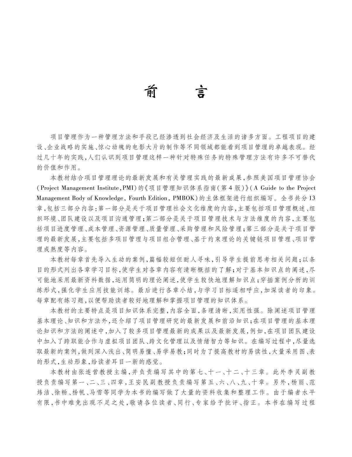 本教材是高等学校工程管理专业系列教材之一,是结合项目管理理论的最新发展和有关管理实践的最新成果,参照美国项目管理协会(Project Management Institute,PMI)的《项目管理知识体系指南(第4版)》(A Guide to the Project Management Body of Knowledge, Fourth Edition, PMBOK)的主体框架进行组织编写。全书共分13章,包括三部分内容:第一部分是关于项目管理社会文化维度的内容,主要包括项目管理概述、组织环境、团队建设以及项目沟通管理;第二部分是关于项目管理技术与方法维度的内容,主要包括项目进度管理、成本管理、资源管理、质量管理、采购管理和风险管理等;第三部分是关于项目管理的最新发展,主要包括多项目管理与项目组合管理、基于约束理论的关键链项目管理、项目管理成熟度等内容。 本教材可以作为高等院校项目管理、工程管理、工业工程专业的本科生、研究生阅读学习的教材,也可作为想掌握项目管理知识的相关从业人员的参考书。 |