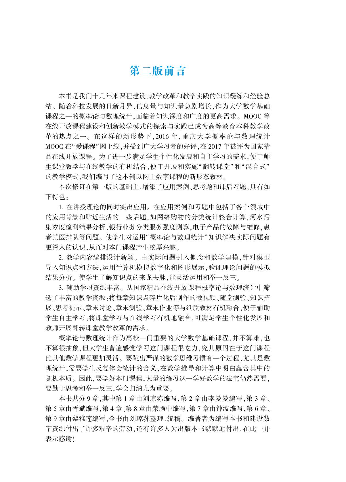 本书主要内容包括随机事件及其概率、一维随机变量及其分布、多维随机变量及其分布、随机变量的数字特征、极限定理、数理统计的基本概念、参数估计、假设检验、回归分析等9章。本次修订在第一版的基础上,增添和更新了应用案例、思考题和课后习题,增添的应用案例更加贴近生活和当前的热点研究问题,如电子商务、排队服务、交通运输、通信技术、生物医学、经济等问题。编者从团队制作的国家精品在线开放课程概率论与数理统计中筛选了包括微视频、随堂测验、知识拓展、思考提示、章末讨论、章末测验、章末作业、交互模拟试验等优质资源与纸质教材有机结合,便于辅助学生自主学习,满足学生个性化发展和教师开展翻转课堂教学改革的需求。 本书简明扼要、通俗易懂、注重应用、适应面广,可作为高等学校理工类、经管类专业具备微积分基础知识的学生的教材,也可作为实际工作者的应用参考书和工具书。 |